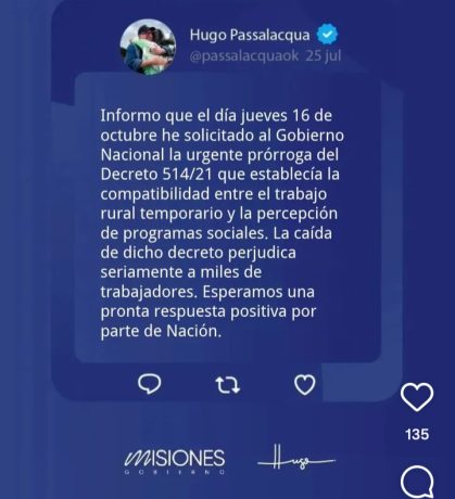 El gobernador Hugo Passalacqua informó, en sus redes sociales, que el jueves 16 de octubre se solicitó oficialmente al Gobierno Nacional la prórroga urgente del Decreto 514/2021, medida que había establecido la compatibilidad entre el empleo rural temporario y los programas sociales.
