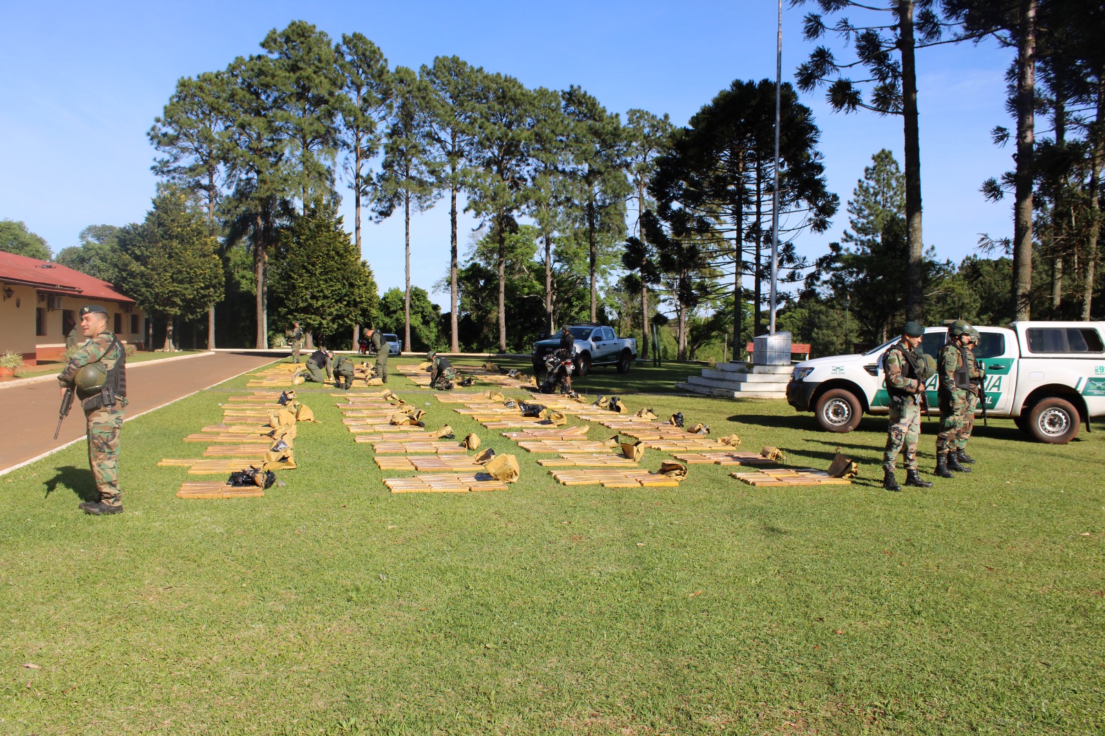 Durante la madrugada de hoy, los gendarmes inspeccionaron el domicilio y hallaron 80 bultos que poseían 2.156 paquetes rectangulares que sometidos a la prueba de campo Narcotest dio como resultado positivo para marihuana con un peso total de 1.838 kilos 275 gramos.