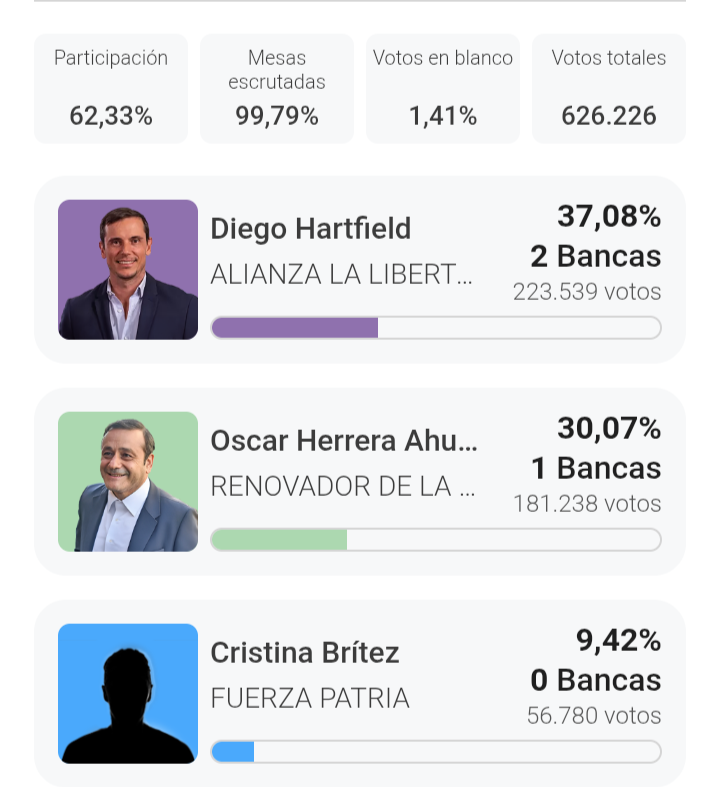 La Lista 503 – Alianza La Libertad Avanza, encabezada por Diego Hartfield, obtiene 158.780 votos, equivalentes al 37,43% del total. En segundo lugar se ubica la Lista 501 – Renovador de la Concordia NEO, liderada por Oscar Herrera Ahuad, con 126.634 votos, que representan el 29,85%.