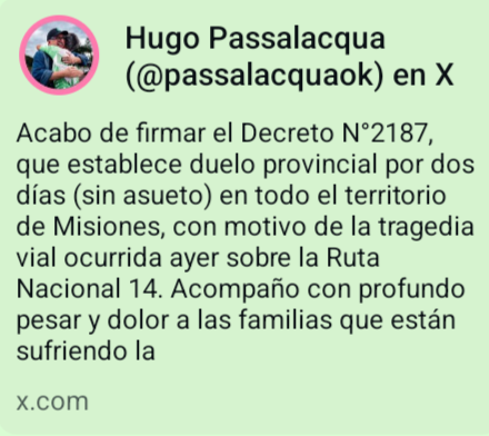 A través del Decreto N.º 2187 del día de la fecha, el gobernador de Misiones, Hugo Passalacqua, dispuso dos días de duelo en toda la provincia, a raíz del trágico accidente de tránsito ocurrido en la madrugada del domingo en Campo Viera.