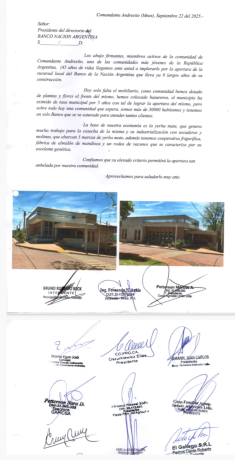 A través de una nota firmada, enviada al Presidente del Banco de la Nación Argentina, «miembros activos de la comunidad» emplazada en el norte provincial «imploran» la pronta apertura de la sucursal local de la entidad bancaria. Observaron en la misiva que el local donde funcionará «lleva ya largos años de su construcción».
