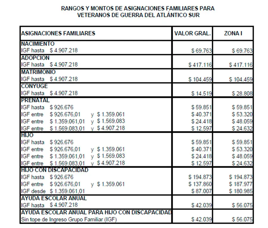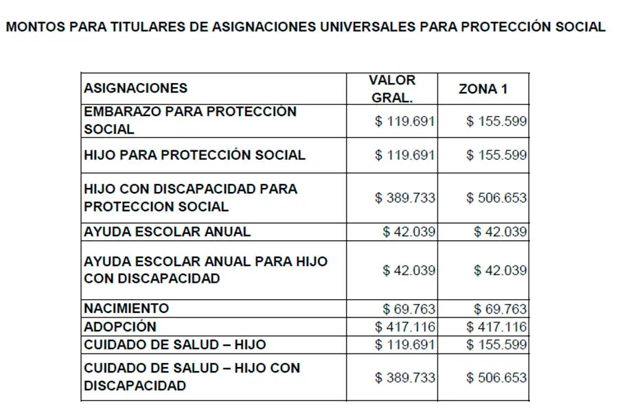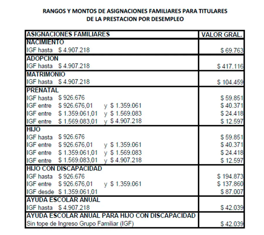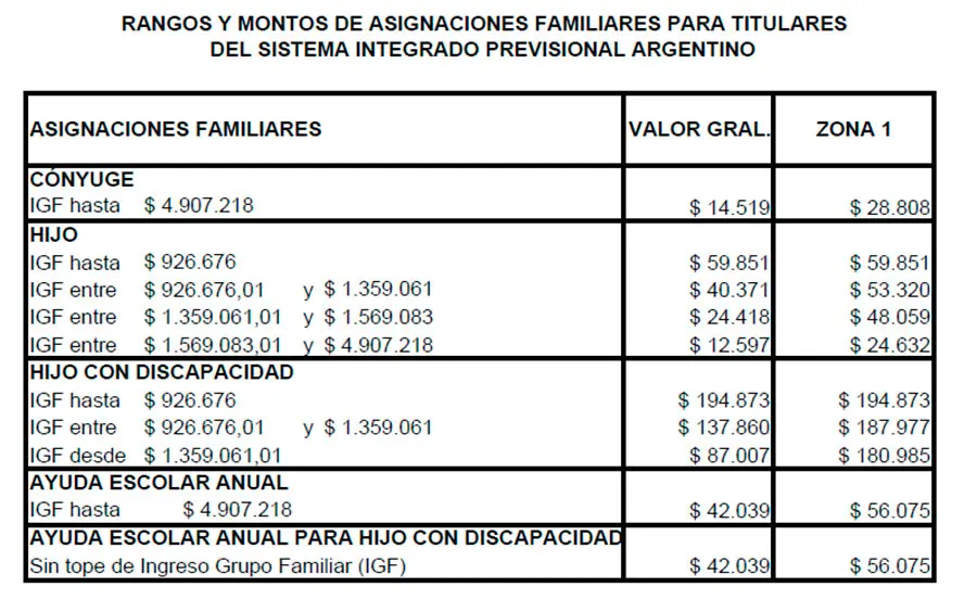 En tanto, la Asignación por Nacimiento será de $ 69.763, la Asignación por Adopción aumentará a $ 417.116 la Asignación por Matrimonio trepará $ 104.459 siempre que el Ingreso General Familiar (IGF) no supere los $ 4.907.218. La asignación Prenatal escalará $ 59.851 para los sectores que perciban menores haberes, con variaciones basadas en el ingreso familiar, descendiendo hasta $ 12.597 según el rango arriba explicitado.