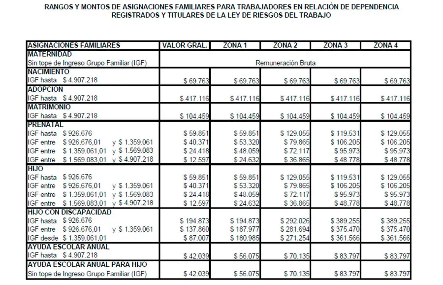 Las asignaciones por hijo y prenatal, que se determinan por rango de ingresos familiares (IGF), para los trabajadores en relación de dependencia, serán las siguientes: