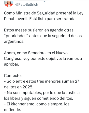 A través de sus redes sociales, Bullrich afirmó que el proyecto está listo para ser tratado y cuestionó que, en los últimos meses, “pusieron en agenda otras «prioridades» antes que la seguridad de los argentinos”.