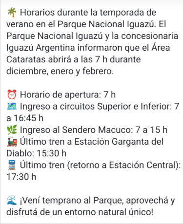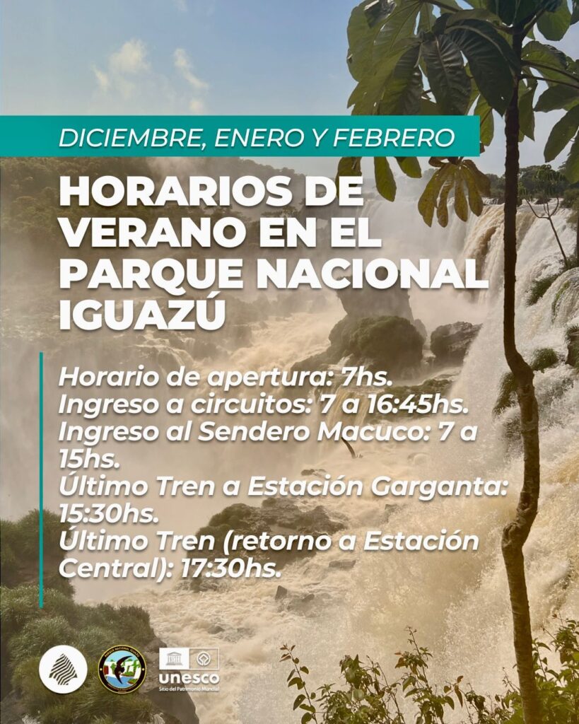 Con el objetivo de mejorar la experiencia de los visitantes durante la temporada de verano, el Parque Nacional Iguazú y la concesionaria del área de servicios, Iguazú Argentina S.A. (IASA), anunciaron los nuevos horarios de atención al público durante la temporada de verano. El parque abrirá sus puertas a las 7 durante diciembre, enero y febrero.