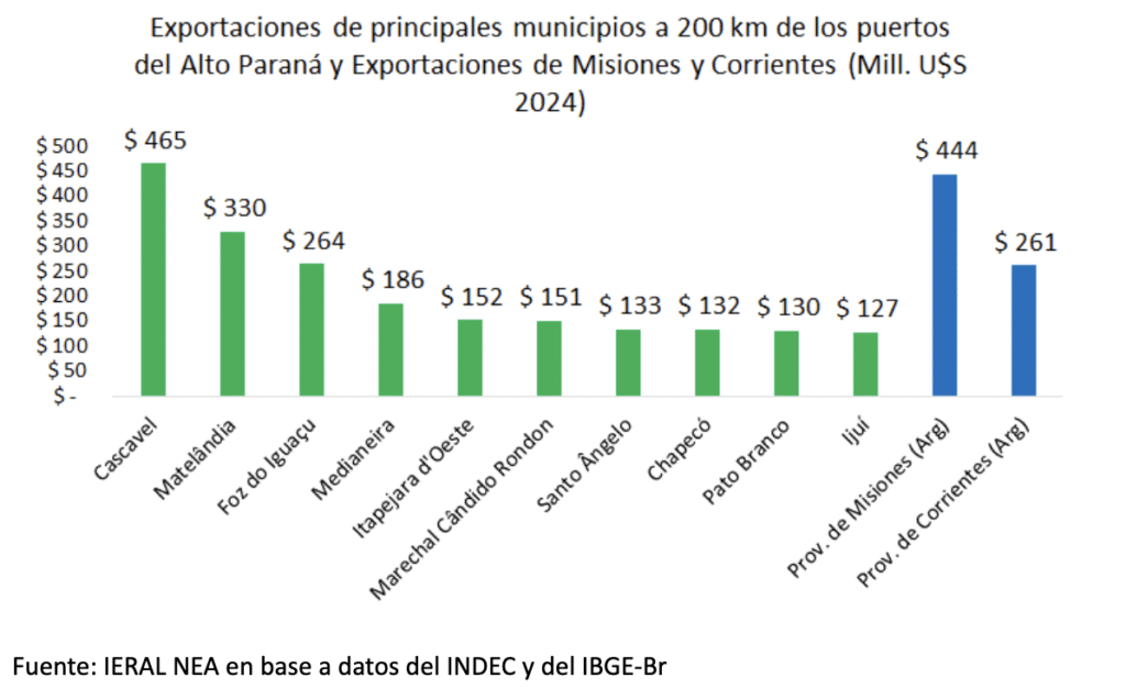 Municipios brasileños cercanos, como Cascavel (US$465 millones), Matelândia (US$330 millones) y Foz do Iguaçu (US$265 millones), exportan volúmenes que superan ampliamente todo el comercio exterior misionero y correntino juntos. De hecho, una sola ciudad brasileña en la frontera mueve más que toda la provincia de Misiones.