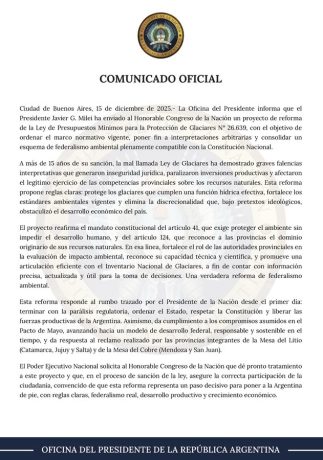 El Gobierno nacional envió este lunes al Congreso el proyecto de reforma de la Ley de Protección de Glaciares, en el marco del período de sesiones extraordinarias que rige hasta el próximo 30 de diciembre. El anuncio fue realizado por la Oficina del Presidente a través de un comunicado difundido en redes sociales.