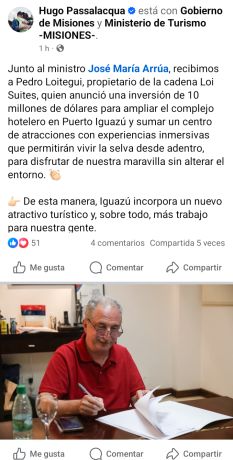 El gobernador de Misiones, Hugo Passalacqua, junto al ministro de Turismo, José María Arrúa, mantuvo un encuentro clave con Pedro Loitegui, propietario de la cadena Loi Suites. Durante la reunión celebrada este miércoles, se formalizó el anuncio de una inversión que alcanza los 10 millones de dólares, que se destinará íntegramente al complejo hotelero ubicado en Puerto Iguazú.