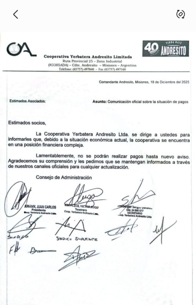 La Cooperativa Yerbatera Andresito Limitada comunicó oficialmente que no podrá realizar pagos a sus socios hasta nuevo aviso, en el marco de una situación económica que —según expresa— la ubica en una posición financiera compleja.