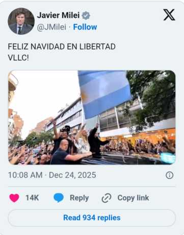 El presidente Javier Milei publicó este miércoles un mensaje en redes sociales para celebrar las Fiestas y prometió mayores reformas para el segundo tramo de la gestión: “Abróchense los cinturones porque van a haber muchas más reformas”, dice en el video que utilizó para celebrar Noche Buena y Navidad.
