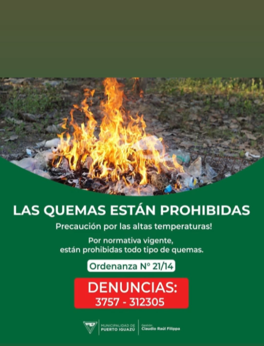 Desde la Dirección de Saneamiento Ambiental de Iguazú hace un llamado a la comunidad para detener la quema de basura. La Municipalidad local recuerda que en toda el área urbana está prohibido todo tipo de quemas para evitar propagación del fuego y posibles incendios.