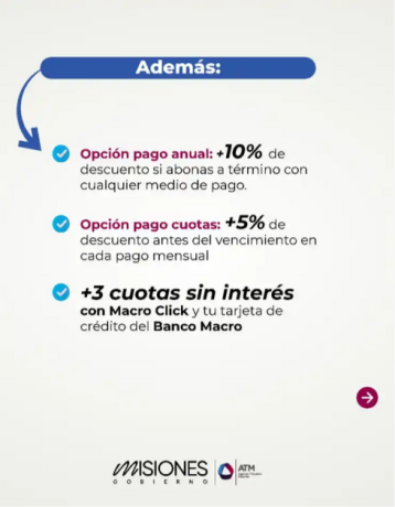 La Agencia Tributaria de Misiones lanzó descuentos de hasta el 40% para quienes opten por el pago anual. Además, durante enero se podrá financiar la obligación en tres cuotas sin interés a través del Banco Macro.