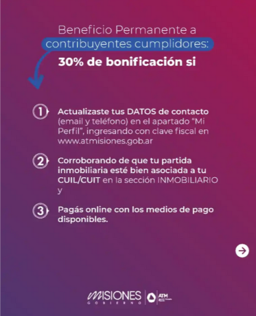 A estos porcentajes se les puede sumar un 30% de bonificación adicional por digitalización. Para acceder a este beneficio extra, los usuarios deben iniciar sesión con su Clave Fiscal en www.atm.misiones.gob.ar, y realizar el pago desde la sección “Mi Perfil” mediante canales online.