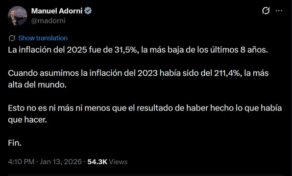 Por último, el Jefe de Gabinete Manuel Adorni indicó que la baja de la inflación “no es ni más ni menos que el resultado de haber hecho lo que había que hacer”.