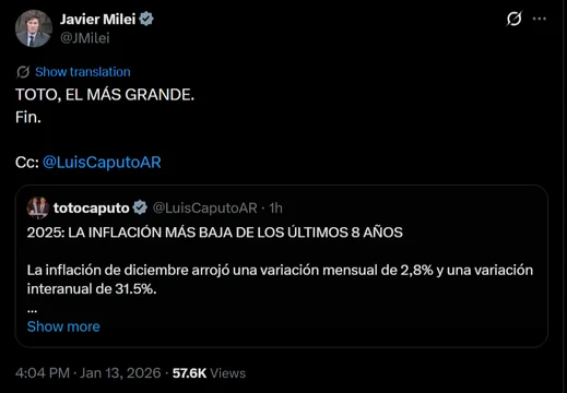 Por su parte, el presidente Javier Milei fue breve en su mensaje y agradeció a su Ministro económico.