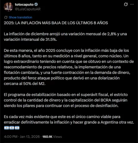 El ministro de Economía, Luis Caputo, detalló los logros por los cuales la inflación anual cerró en el nivel más bajo desde 2017.