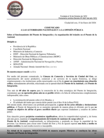 En relación al Puente de la Amistad, el comunicado exige el cese inmediato del uso de la cabecera paraguaya como área de estacionamiento de camiones y maquinarias, práctica que genera largas filas sobre el puente y representa un riesgo para la seguridad estructural y operativa.