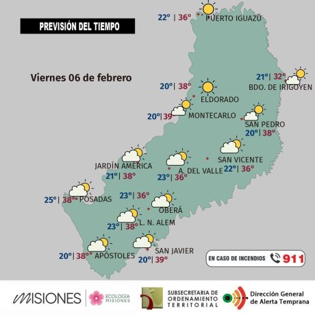 Temperaturas: máxima en la provincia estimada en 39 °C para Montecarlo, con 41°C de sensación térmica la mínima sería de 20 °C en Apóstoles.