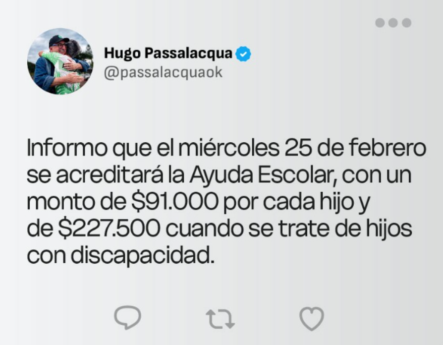 El gobernador Hugo Passalacqua informó que el próximo miércoles 25 de febrero se acreditará la Ayuda Escolar en la provincia. El anuncio precisa los montos que percibirán los beneficiarios en el marco de este acompañamiento anual.