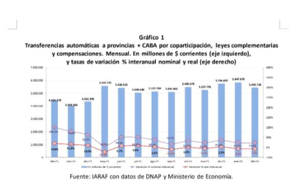 Descontando el proceso inflacionario del período, esto se traduciría en una baja real del 7,4%. Por su parte, la coparticipación, es decir las transferencias automáticas menos leyes complementarias y compensaciones, habrían descendido un 8,8% real. Según la información suministrada por la DNAP, la caída de la coparticipación neta en febrero se debería principalmente a la disminución real interanual del 13% del IVA, mientras que el impuesto a las ganancias también mostró una variación negativa, del 0,8%. En conjunto la recaudación de IVA e IIGG habría registrado una baja real interanual del 8,3%.