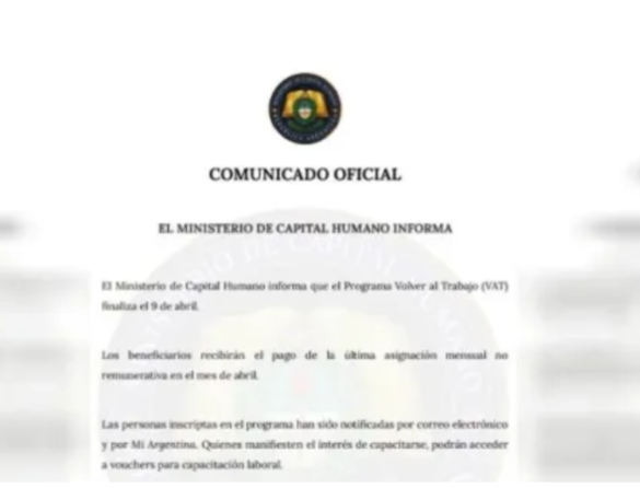 El Ministerio de Capital Humano informó que el programa Volver al Trabajo finalizará el mes próximo y comunicó que el 9 de abril será el último día donde los beneficiarios “recibirán el pago de la última asignación”.
