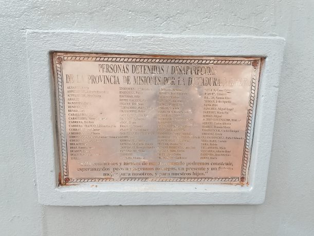 Allí, la placa con los nombres de los familiares perseguidos y desaparecidos de Misiones invita a la comunidad a no olvidar.