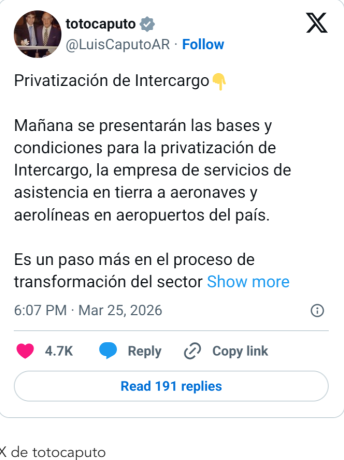 En noviembre de 2024, en medio de un paro de trabajadores aeroportuarios, Manuel Adorni había anunciado “la desregulación del servicio de rampas en aeropuertos para terminar con el monopolio de Intercargo y dar lugar a la participación de nuevas empresas”.