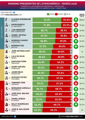 El informe de marzo 2026 de CB Global Data revela un nuevo mapa del poder en América Latina. Mientras la mandataria de México se consolida en la cima, el presidente argentino,Javier Milei, registra el peor desempeño del mes en todo el continente.