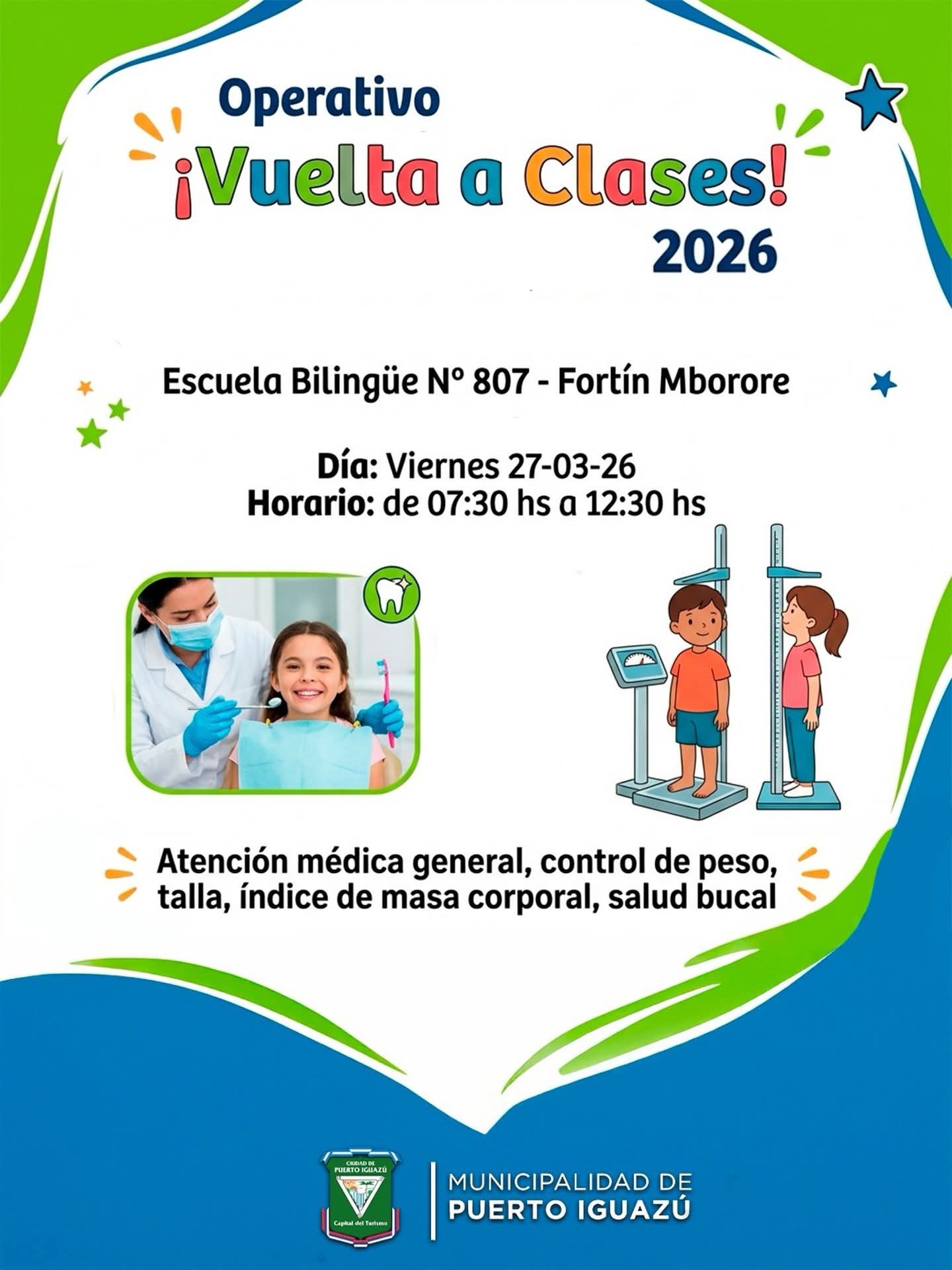 Mañana viernes 27 de marzo, de 7:30 a 12:30 horas, el equipo de salud estará presente en la Escuela Bilingüe N° 807 “Fortín Mbororé”, donde se realizarán certificados de buena salud para los alumnos.
