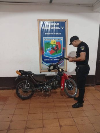 A horas 02.30 efectivos de la comisaría seccional 2da siguiendo la investigación de un hecho de robo motocicleta ocurrido en el barrio Villa Alta en la tarde del sábado en perjuicio de un joven de 19 años, llegaron hasta el barrio 1 de Mayo donde lograron recuperar el motovehículo el cual se hallaba abandonada, con faltante de plástico lo que se presume que estaba próximo a ser desarmada. Se procedió al secuestro y al traslado a sede policial, a fines de ser restituido a su legítimo propietario.