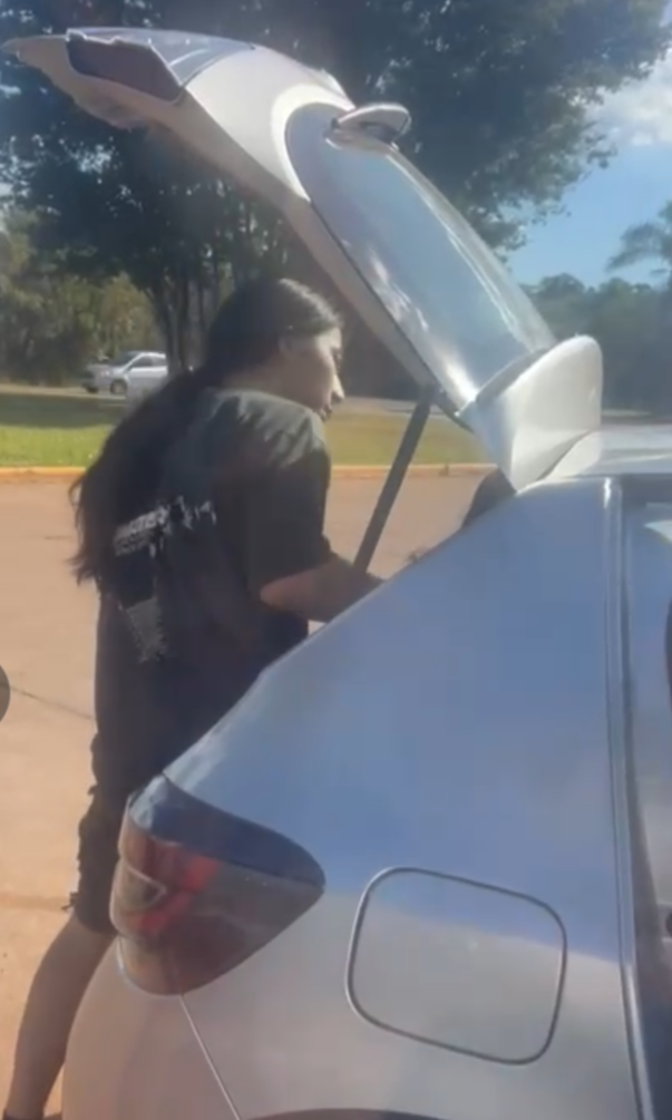 Un joven con cabello largo y remera negra se mete al baúl, mientras otra mujer con top floreado sostiene el baúl levantado. En las tomas se observa claramente cómo el joven ingresa al sector de carga del automóvil, que ya transportaba a otros ocupantes en los asientos.