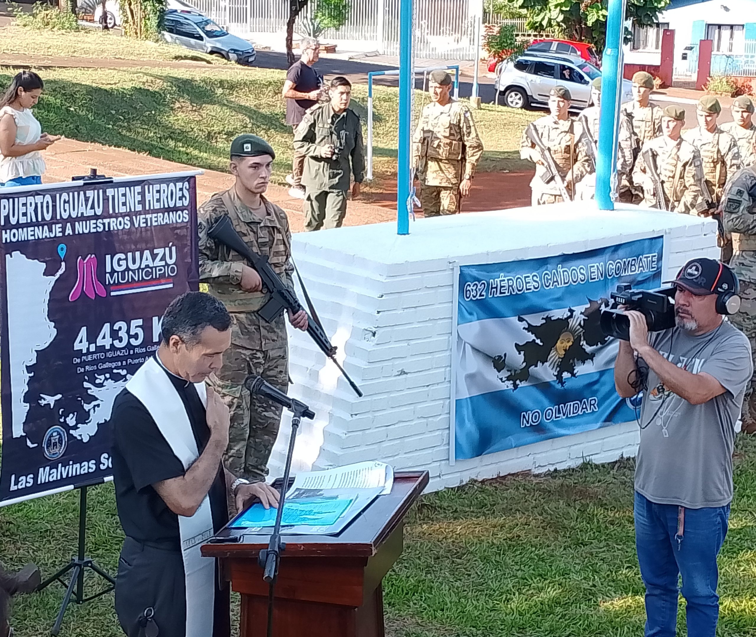 El Pbro. Julio César Larramendi, párroco de la Parroquia Catedral Virgen del Carmen, presidió la bendición del acto y pronunció una sentida alocución. En ella recordó los 44 años transcurridos desde la gesta de Malvinas, un hecho histórico que marcó para siempre el espíritu de los argentinos.
