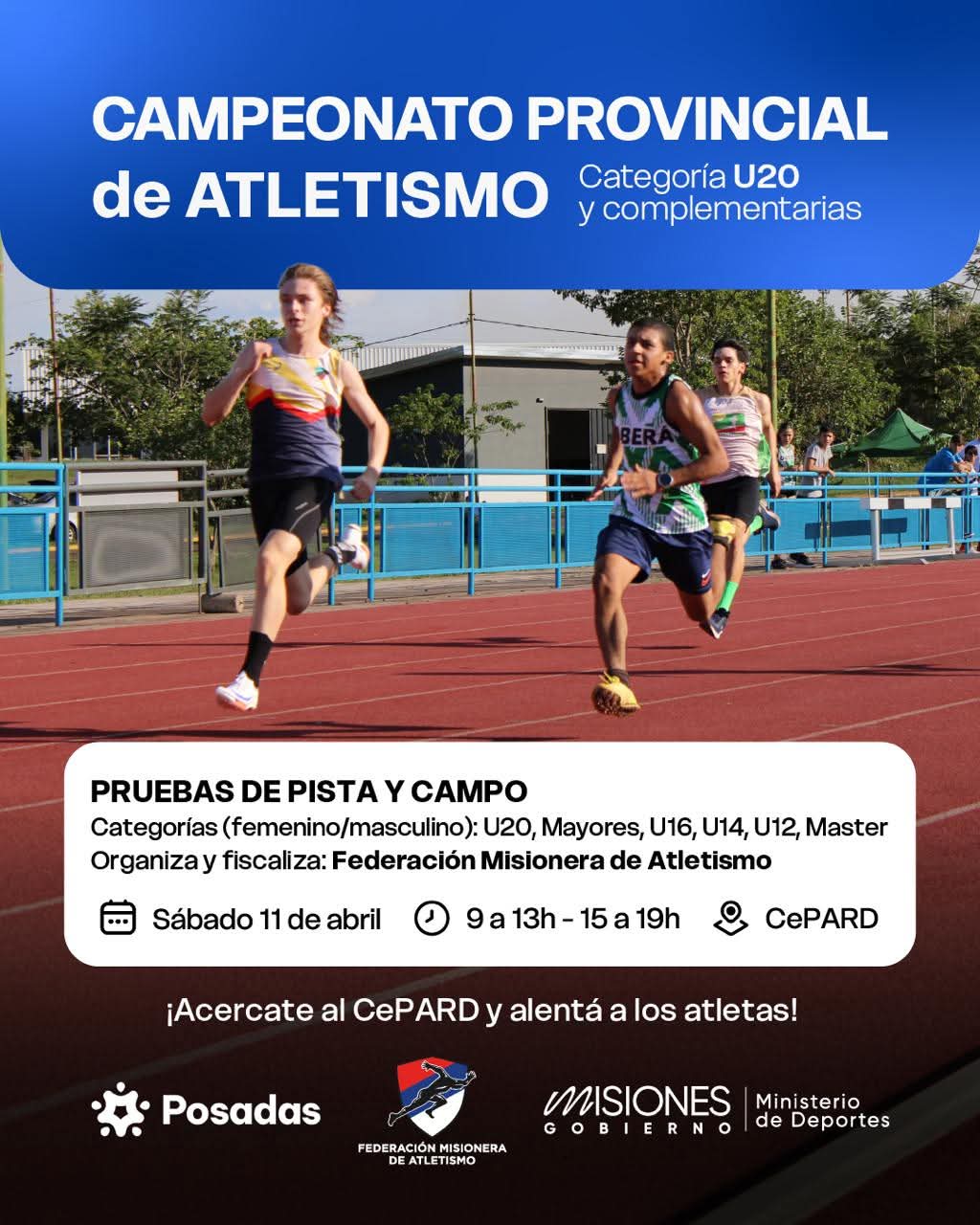 El calendario deportivo del atletismo misionero continuará el próximo sábado en la pista del CePARD, en la ciudad de Posadas, cuando se dispute el Campeonato Provincial para la categoría U20 y complementarias.