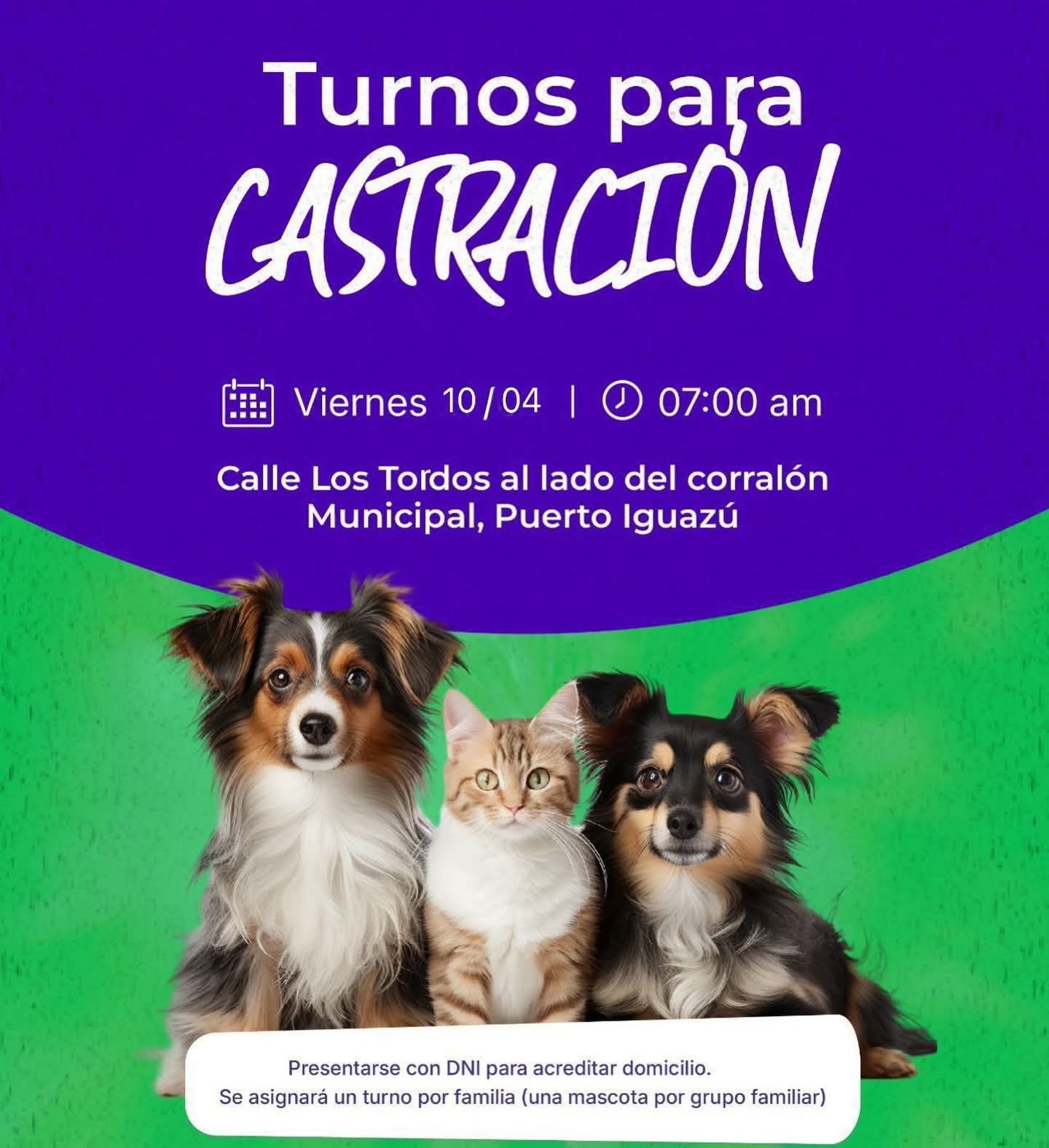 La Dirección de Zoonosis de la Municipalidad de Puerto Iguazú abre este viernes 10 de abril una nueva jornada de turnos para castración gratuita de perros y gatos, en el marco del programa de control poblacional y tenencia responsable de mascotas.