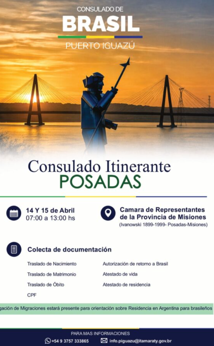 El Consulado de Brasil en Puerto Iguazú llevará adelante un operativo itinerante en la ciudad de Posadas, donde se recibirán documentos y se brindará asesoramiento para distintas gestiones consulares. La atención se realizará los días 14 y 15 de abril, en el horario de 7 a 13 horas.