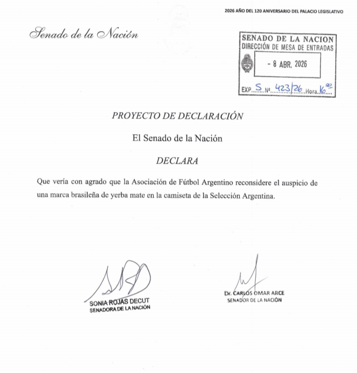 Los senadores nacionales por Misiones, Sonia Rojas Decut y Carlos Omar Arce, presentaron un proyecto de declaración en el Senado para que la AFA reconsidere el acuerdo comercial con una marca brasileña de yerba mate como sponsor de la Selección Argentina.