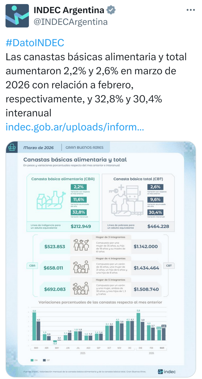 Durante marzo de 2026, la variación mensual de la canasta básica alimentaria (CBA) fue de 2,2% mientras que la de la canasta básica total (CBT) fue de 2,6%. La CBA y la CBT registraron variaciones interanuales de 32,8% y de 30,4%, respectivamente.