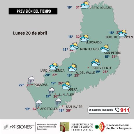 Las temperaturas oscilarán entre una mínima de 18°C (San Javier) y una máxima de 32°C (Montecarlo), con sensación térmica que podría alcanzar los 39°C. Se esperan precipitaciones de entre 5 y 12 mm, con probabilidades del 30 al 64%. Los vientos soplarán con ráfagas de 20 a 50 km/h del noreste y sureste. Baja probabilidad de nieblas.