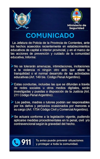 En tanto, en Corrientes, la Policía provincial también avanzó con una postura similar. A través de un comunicado oficial, se advirtió que no se tolerarán intimidaciones y que los casos serán investigados bajo el delito de intimidación pública, contemplado en el Código Penal.