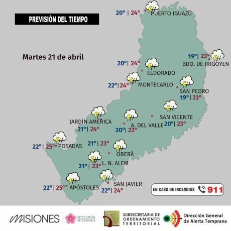 En cuanto a las temperaturas, la persistente cobertura nubosa mantendrá los valores apenas cálidos. La máxima estimada para la provincia será de 25 °C en San Javier, mientras que la mínima rondará los 19 °C en San Pedro.