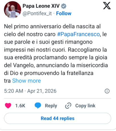 La cuenta Pontifex remarcó la necesidad de mantener viva la memoria de Francisco y de imitar su capacidad de diálogo y cercanía pastoral, ejes centrales del mensaje recordado en el aniversario.