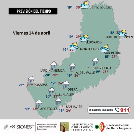 Temperaturas: Máxima de 26 °C en Iguazú y mínima de 18 °C en San Pedro.
