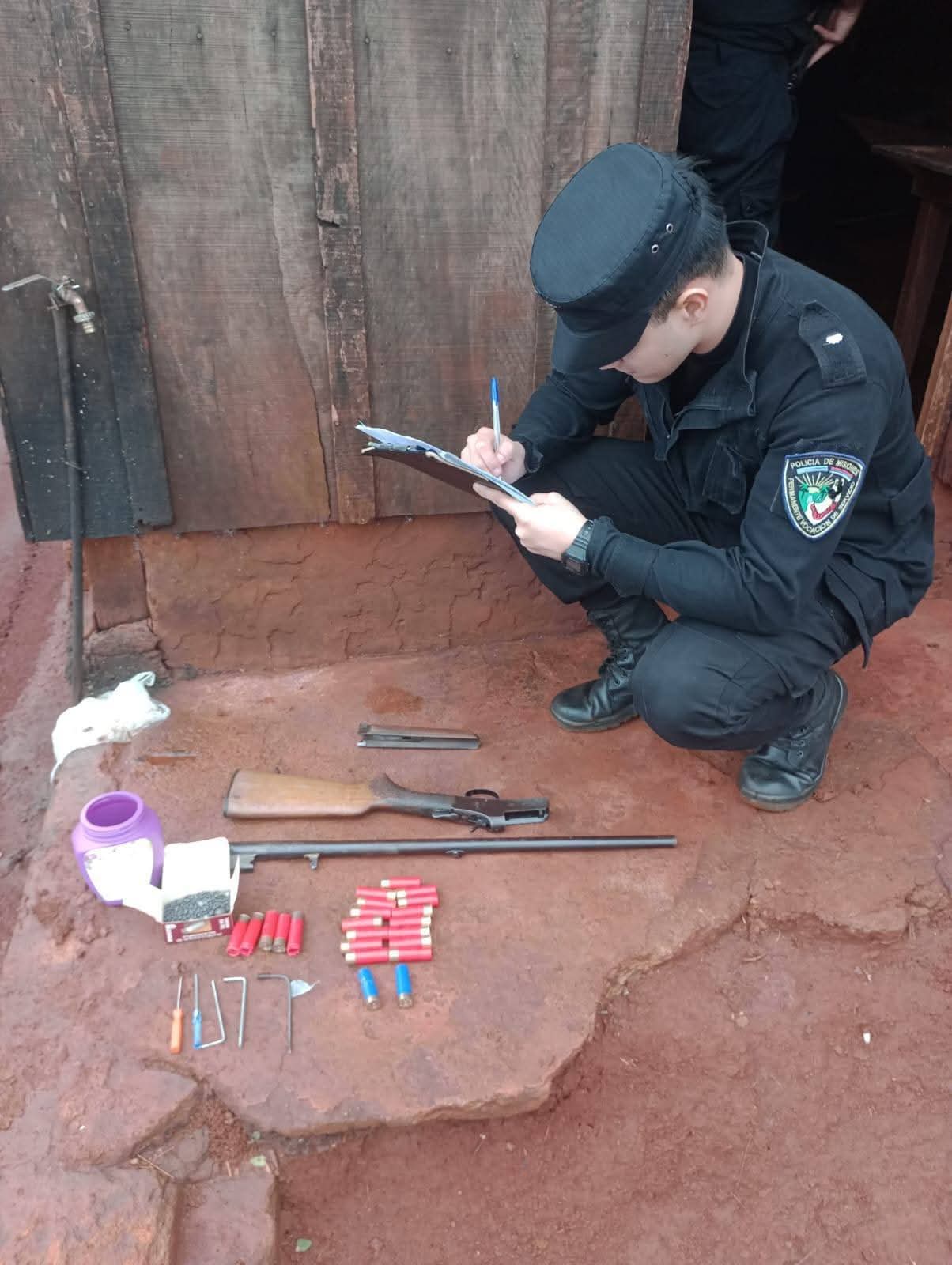 En el interior de la vivienda se halló además un arma de fuego tipo escopeta calibre 16, junto a 18 cartuchos del mismo calibre y perdigones sueltos.