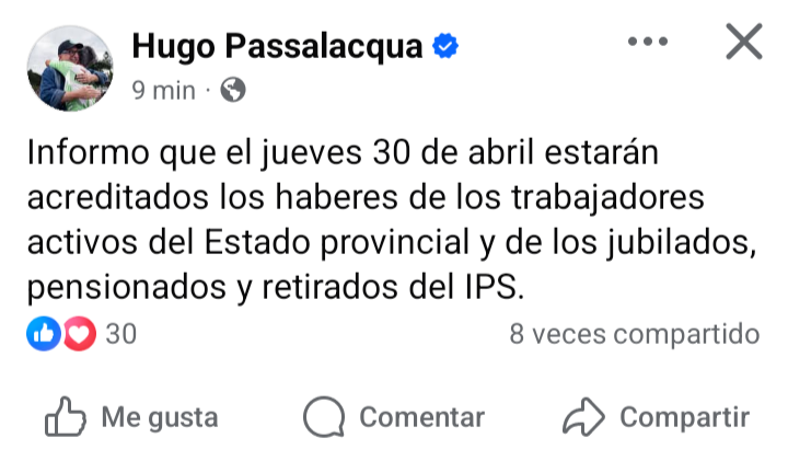 El gobernador de Misiones, Hugo Passalacqua, anunció a través de sus redes sociales que este jueves 30 de Abril estarán acreditados los haberes de los trabajadores activos de la Provincia, como también de los jubilados, pensionados y retirados del Instituto de Previsión Social (IPS).