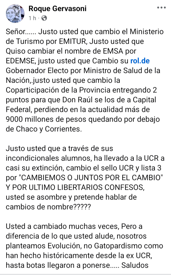 “Usted ha cambiado muchas veces. Pero a diferencia de lo que usted alude, nosotros planteamos Evolución, no Gatopardismo como han hecho históricamente desde la ex UCR, hasta botas llegaron a ponerse… Saludos.”