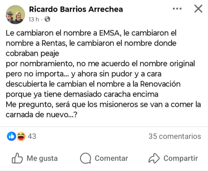 “Le cambiaron el nombre a EMSA, le cambiaron el nombre a Rentas, le cambiaron el nombre donde cobraban peaje por nombramiento, no me acuerdo el nombre original pero no importa… y ahora sin pudor y a cara descubierta le cambian el nombre a la Renovación porque ya tiene demasiado caracha encima. Me pregunto, será que los misioneros se van a comer la carnada de nuevo…?”
